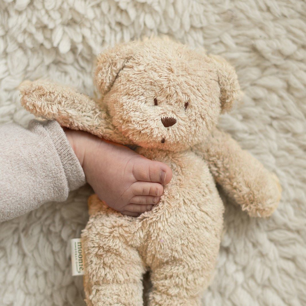 Een klein vriendje van de Moonie knuffels met licht en geluid. Deze heerlijk zachte mini knuffel, gemaakt van GOTS-gecertificeerd biologisch katoen en gevuld met gerecyclede materialen, heeft een buikje gevuld met fijne sensorische korrels die rustgevend aanvoelen in kleine handjes en het tastgevoel en fijne motoriek stimuleren.